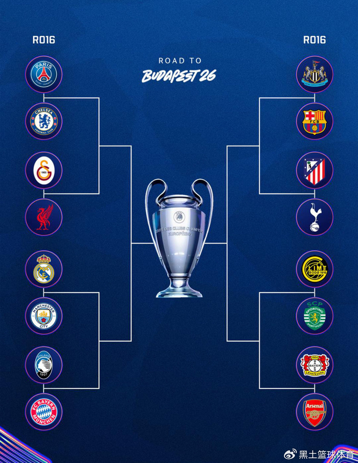 抽签仪式在欧足联总部完成,十六强全部出炉。没有任何原则回避,同国球队可以内战,豪门可以提前相遇。结果不出意外火星四溅:三组重磅对决瞬间点燃:欧洲皇马VS曼城、巴黎VS切尔西、巴萨VS纽卡斯尔。