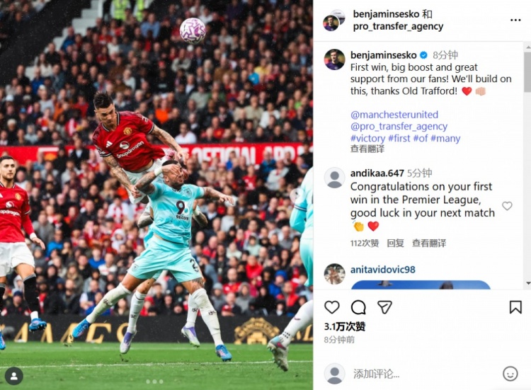 赛后舍什科在社交平台表示:“赛季首胜令人振奋,感谢球迷全力支持。我们将继续在梦剧场全力以赴!”