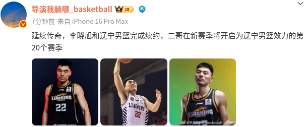 社媒原文:“延续传奇,李晓旭和辽宁男篮完成续约,二哥在新赛季将开启为辽宁男篮效力的第20个赛季。”