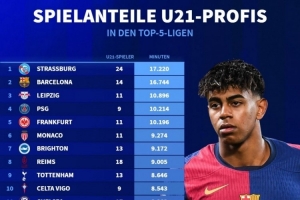 体育资讯3月29日讯 德国转会市场统计了本赛季五大联赛球队U21球员的出场时间,并列出排名,斯特拉斯堡居首,巴萨、莱比锡排名二三位。