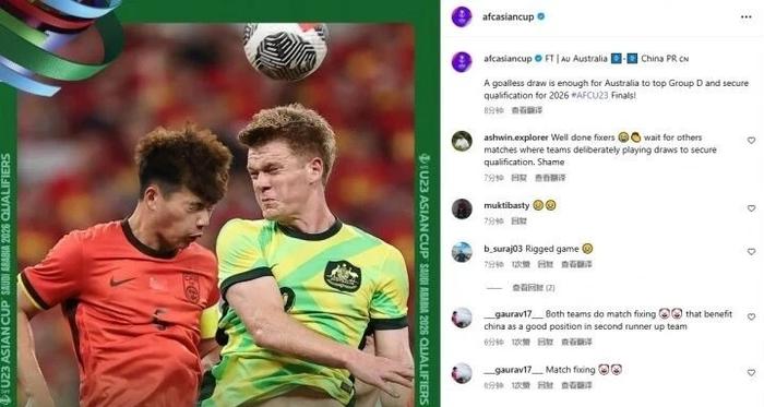 2025年9月10日,U23国足赢球后,亚足联发布了有关战报,可仅过了2个小时,一些外国球迷竟然跑到评论区留言举报。有的人直接用“假球”形容中澳之战,也有人表示“(2队)操纵的比赛”,还有人气急败坏地说:“这明显就是假球,踢得太消极了。”更有极端的外国球迷竟然这么说:“这是假球,亚足联赶紧调查这场假球,取消他们的出线资格。”可以看出来,U23国足与澳大利亚一起出线了似乎令外国球迷酸了。