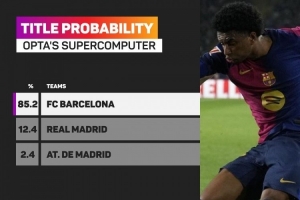 体育资讯4月7日讯 Opta超级计算机预测了本赛季西甲夺冠概率,巴萨85.2%最高,皇马12.4%。